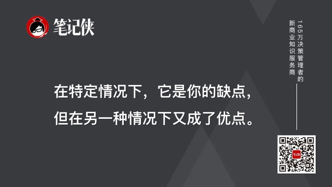 所以我一直不同意把人分优缺点这种判断方法,我们说优点缺点是个共生体,共同组成了这个人。在特定情况下,它是缺点,但在另一种情况下又成了优点。