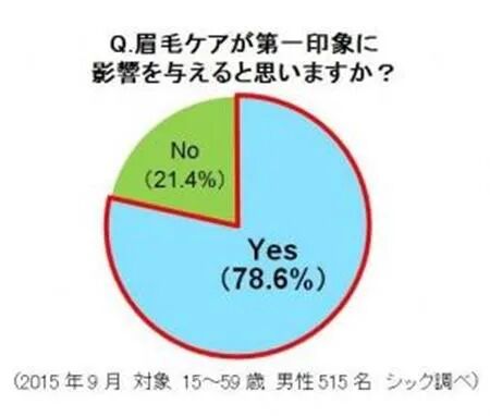 日本《产经新闻》旗下一网站曾经报道过一项针对男性修容的调查,发现有大约78.6%的日本男性认为,无论是在职场还是在恋爱中,“眉形关系着自身给他人留下第一印象好坏”,另一份调查也显示在日本20-40岁的年轻人中,修眉被看做最重要的颜面要素,而40-60岁的中老年男性中,经常修眉的男人也超过了15%。其中有男人认为,即便是服装和发型有多么好看,如果眉毛没有好好处理,第一印象会大减分。
