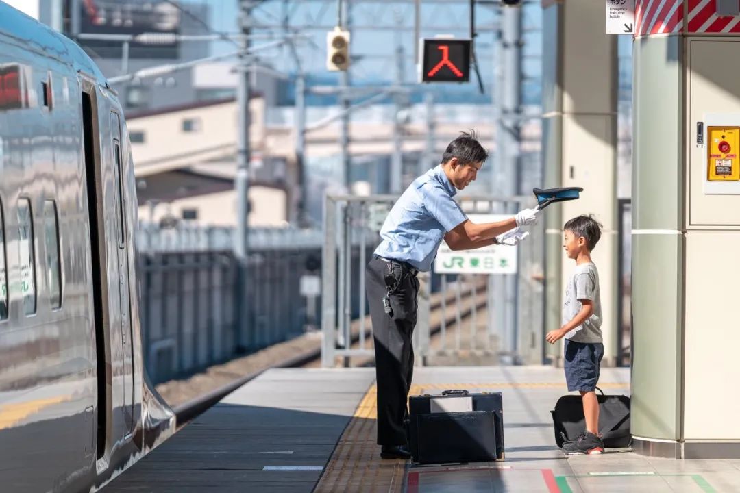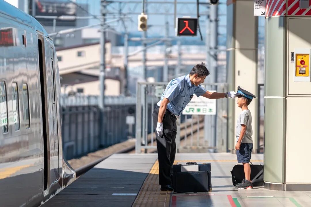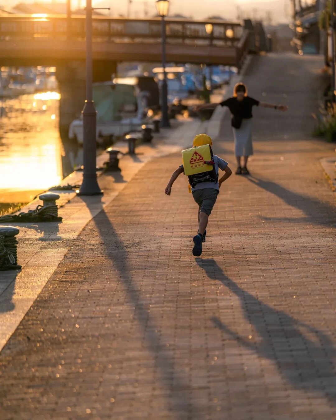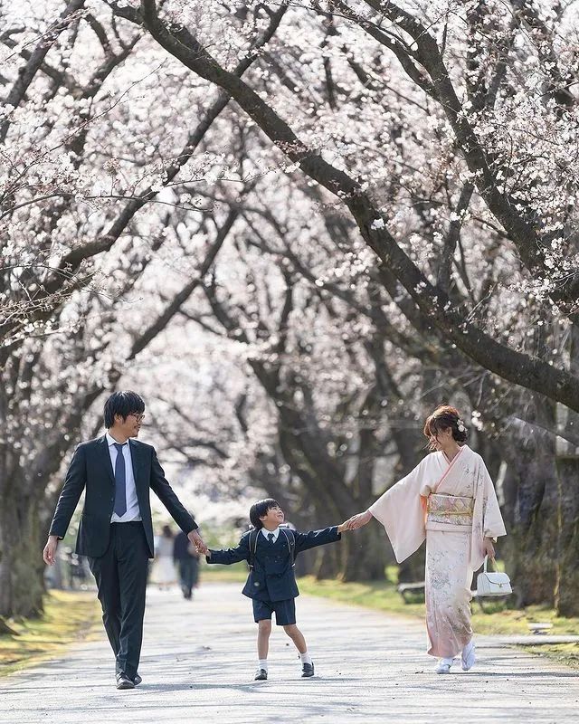 儿子转过头,激动地说:“妈妈,有只小鹿在看我们哦!”在山顶上荡秋千时,稻垣远远地听着母子俩的对话:“妈妈你怕吗?”“有你在,老妈就不怕了。”日子像一支长焦镜头,珍贵、细腻、缓慢,光影灿烂,岁月流金。稻垣说:“在给老婆儿子拍照的过程中,我学会了怎么做一个好爸爸。”和别的父母不一样,稻垣和妻子很少带儿子去逛街,也不爱给儿子报兴趣班。他们喜欢去山里露营,去野外徒步,去参加村子的夏日祭典,让孩子去花海里追蝴蝶。儿子7岁生日时,稻垣也学着别人给小孩奖励了一部游戏机,但他发现,儿子不爱玩。慢慢地,儿子学会了搭帐篷,喜欢上去田里拔土豆,有天他告诉爸爸:“我长大要成为一名乘务员。”或许在别的父母眼中,这不算一个多么伟大的理想,但稻垣夫妇,却努力地守护着孩子的梦。一有时间,他们就去看新干线,富士山下,飞驰而过的列车,仿佛驶向未来。列车到站,乘务员遇到到了一直守候的小孩,他脱下帽子,戴在了孩子的头上。然后,互相敬了一个礼。这组照片一夜之间收获了13万的点赞,人们都说,在爱与梦想中长大的少年,眼里有光。今年,儿子开始上一年级,一家三口在晚樱如雪的季节里,踩着风,牵着手,上学去。