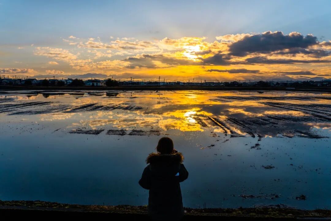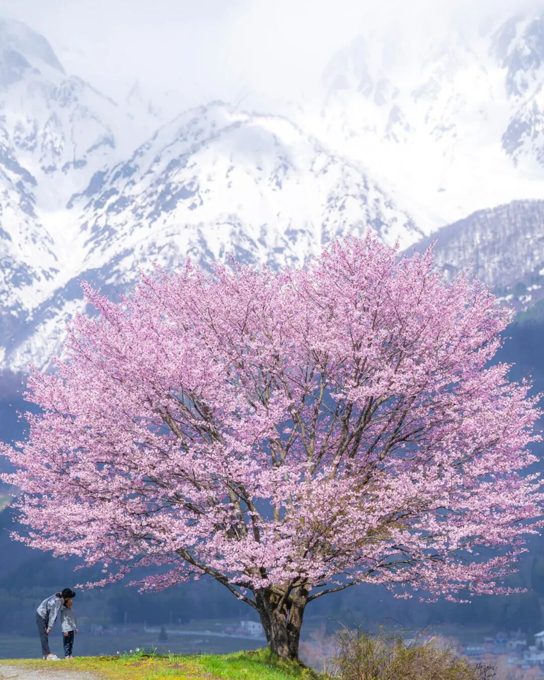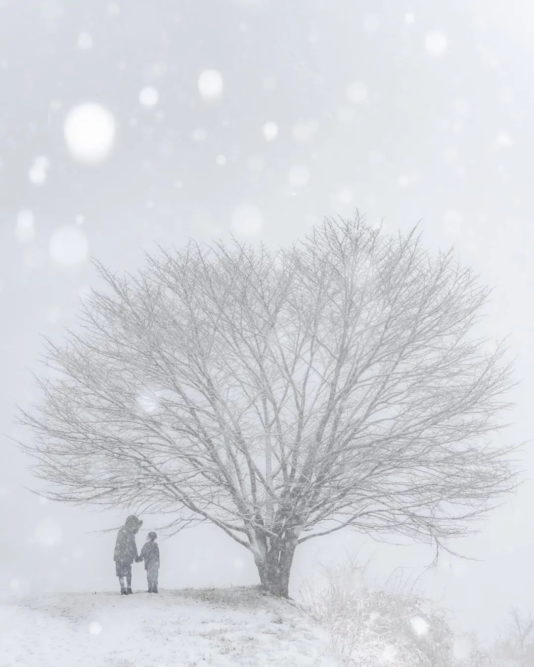 春雪未融,粉樱如瀑,妻子带着儿子站在树下,山野吹过甜甜的风。夏夜蝉鸣,星河璀璨,儿子牵着妈妈走在田间,影子拉成长长的诗。秋高气爽,层林尽染,母子边说边笑,孩童挥舞一根树枝,梦想是保护地球和老妈。冬山如睡,飞雪寒天,他们又回到了那颗樱花树下,年复一年,岁月轮回。爱妻和孩子踏入春秋和山海,“咔嚓”一声,稻垣把这一切,留了下来。