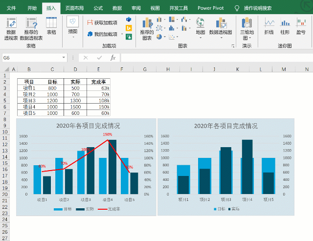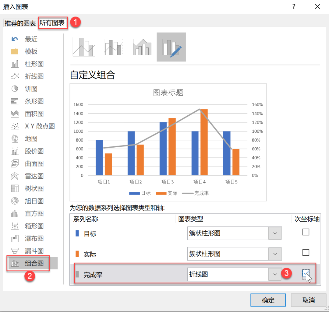 如果推荐的图表不合适也没关系,直接在所有图表,组合图这里,将完成率改成折线图并勾选次坐标轴,这样也可以做到。