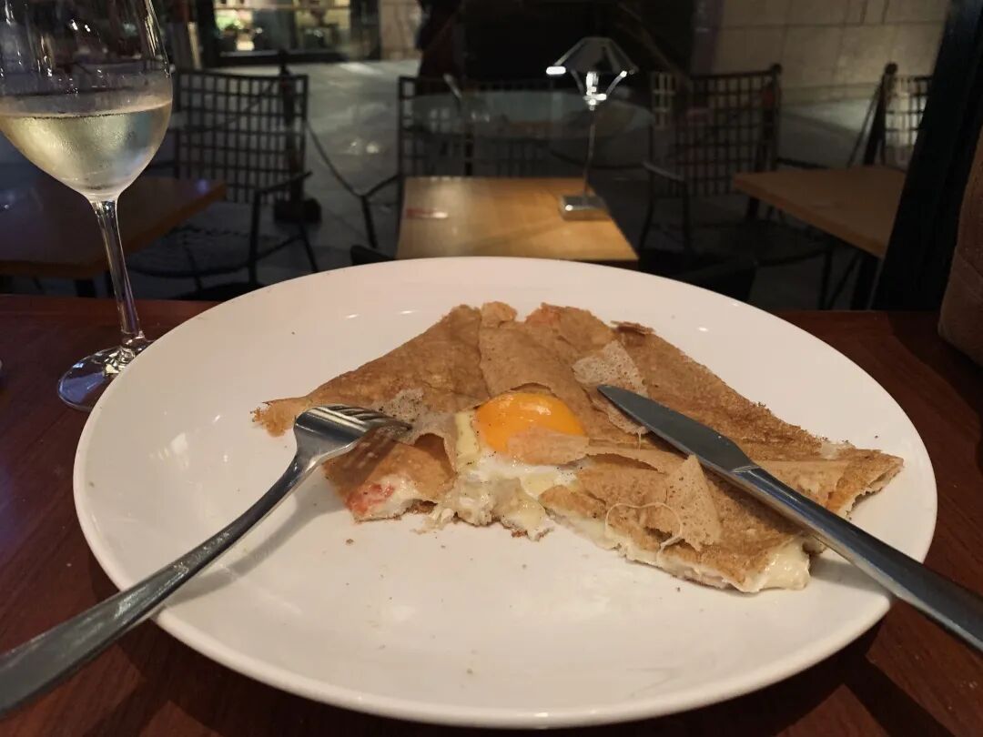 点了一个 Crepes 和咖啡及甜点的套餐,又点了一杯酒,买单时没超过 3000 日元。Crepes 就是法国煎饼,跟国内各式各样的煎饼小吃长相差不多,其实高棟与其说喜欢餐厅,不如讲更喜欢餐具,对口感的重视程度总没餐具那么认真。Joel Robuchon 丸之内的 Café 用的是柳宗理设计的刀叉,不过正餐厅用的还是传统 Fine Dining 常见的 Christofle,盘子和酒杯忘记是哪家了。