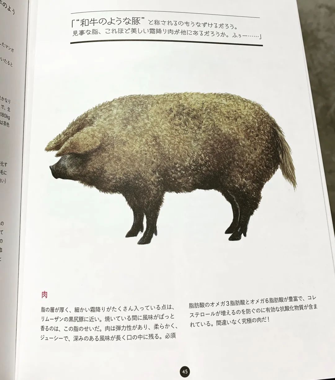 同时也买了这本书,介绍奇奇怪怪又很可爱的食材,这是产自奥地利和匈牙利地区的绵羊猪,英国据说也有过这个品种,猪肉的话这几年市场上很认可西班牙的伊比利亚黑猪,主要分为四个等级,在日本也很常见。绵羊猪倒是没有试过,准备以后找机会试试。