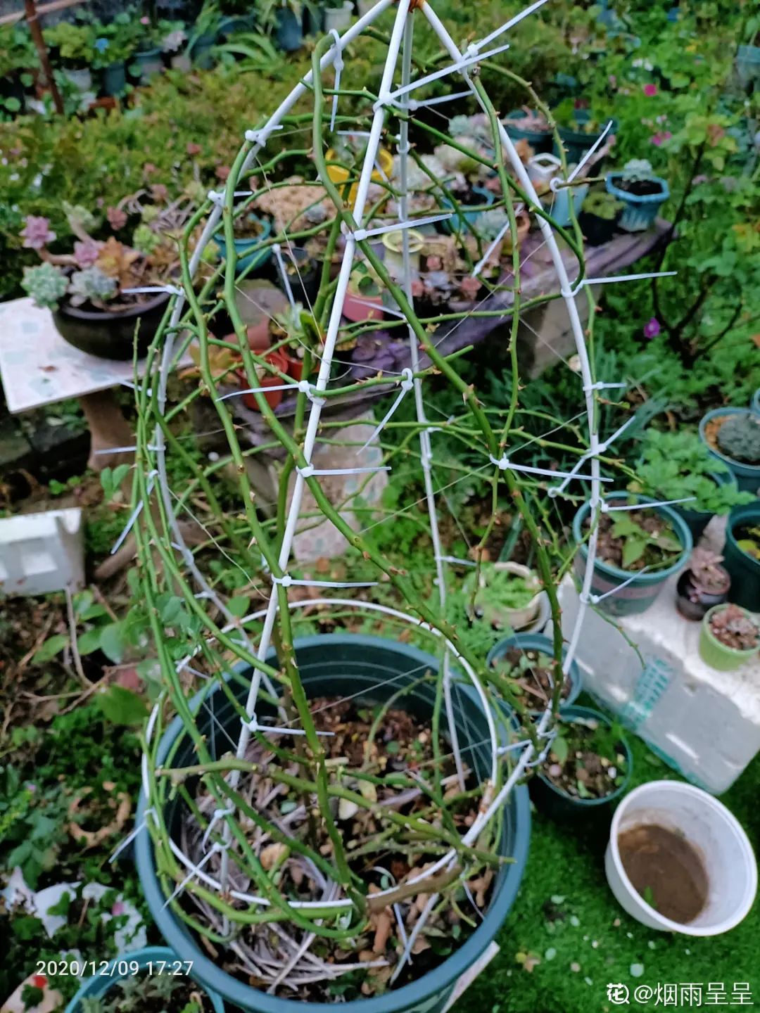 藤本月季,是指可以爬藤的月季,这类月季枝条比较细软,冬季只需轻剪,剪主枝上的小枝,遇到均匀、健壮的也可以留一截,剪完,用塑料扣或花架把枝条固定好,看起来有条理。