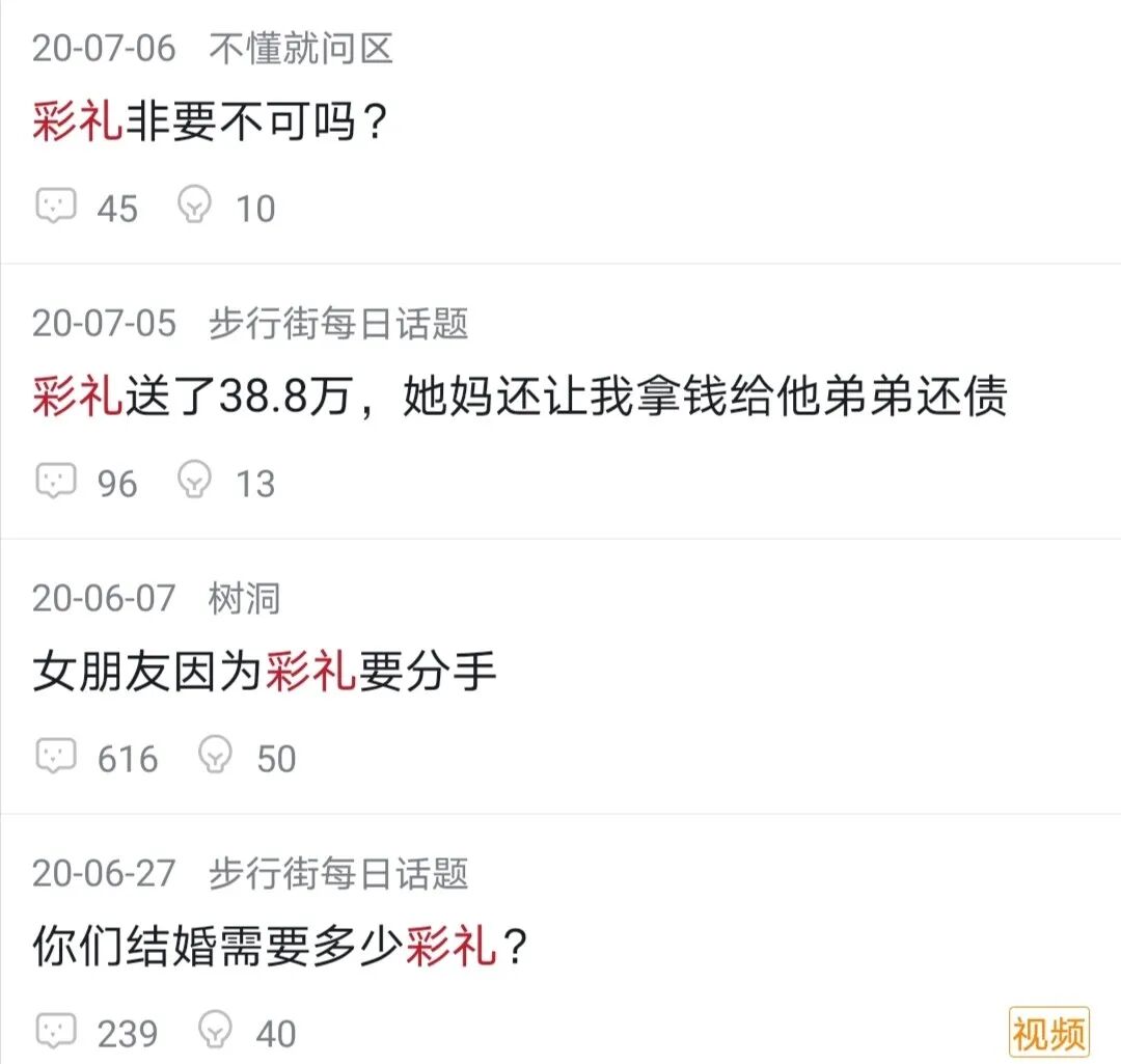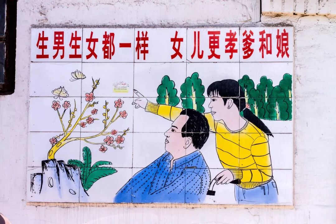 这样的逻辑似乎合情合理,不过只要对两头婚的历史稍作梳理,就发现它既不独属于江浙,更谈不上有什么现代性。在费孝通撰写于1938年的博士论文《江村经济》中,就提到了两头婚的雏形。在江苏省吴江县,有一种“两头挂花幡”的婚姻模式,即女方没有兄弟的家庭要求男方允许他们的女儿为他们传嗣。换句话说,他们有权利将其女儿的一个男孩子作为他们自己的孙子。结婚时,会在两个家的祖宗牌位上插两面花旗,作为传嗣的象征。90年代以来,随着计划生育政策的收紧和全面推进,“多子多福”的生育观被打破,这其中农村地区受到的冲击尤为强烈。2014年5月3日,山东省邹城市凫山街道墙壁上的计划生育瓷砖宣传画“生男生女都一样 女儿更孝爹和娘”。/ 图虫创意作为回应,这一时期类似于两头婚的婚姻模式开始在江苏、浙江、湖南、湖北、广西、福建、云南、四川等近十个省份的农村出现。两边住、两头扯、两边蹲、两头奔、两头婚、并家婚、不招不嫁,尽管每个地区的叫法不尽相同,但都有着非常相似的规矩。除了免去或简化嫁妆和彩礼上的往来以外,婚后两边轮流住,不分爷爷奶奶和外公外婆这些近来被作为重大利好推销的特点之外,也有着双方均为当地人,必须生育两个孩子,各自继承家产这些严格限制。有人觉得,取消彩礼的两头婚是一件好事。/新闻片《陇东婚事》截图两头婚的出现是在独生子女成为主流的大背景下,中国农村地区基于传宗接代的旧思想和老人赡养的新问题创造出的折中产物。它绝非引领时代的先锋探索,而是被时代裹挟其中的权宜之计。在独生子女政策执行前,由于一家一般有多个孩子,无儿子且殷实的家庭就会选择用招女婿上门的“入赘婚”来保证自家有人养老送终,不至于“绝户”。