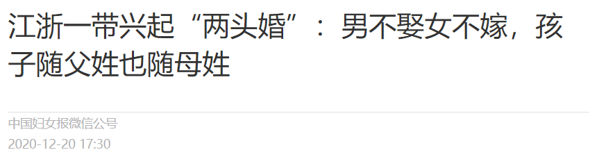 所谓婚姻自由,是选择的自由,年轻人可以选择山川湖海,也可以因为在路上遇到一个人而将此前的种种预设作废不谈,心甘情愿地囿于昼夜厨房与爱。端木异.(2020).冠姓权之争|性别议题背后,中国家庭的变迁与博弈.澎湃思想市场姚改改.(2020).男不娶女不嫁,孩子随父姓也随母姓,这里近年兴起两头婚.中国妇女报兔透射.(2020).传宗接代的产物「两头婚」,也吹成进步典范?大象公会杨丽珍.(2021).“半招娶”婚姻中的家庭关系研究.华东理工大学黄亚慧.(2013).并家婚姻中女儿的身份与地位.妇女研究论丛黄亚慧.(2013).苏南农村婚姻形式变迁的经济因素分析.经济论坛李宽 王会.(2021).风险规避与身份维持:苏南农村并家婚居模式.当代青年研究何绍辉.(2021).论“两家并一家”婚居模式的形成机制.中国青年研究徐芸.(2015).并家婚从何处来,向何处去——以苏州市并家婚为例.南京大学王琳.(2021).婚姻形态与权责义务边界——基于苏南农村并家婚的经验考察.南方人口赵春兰 范丽珠.(2020).论婚姻与生育的社会属性—————少子化背景下浙北乡村婚育模式嬗变的田野观察.河北学刊宋丽娜.(2020).双系婚姻:对于苏南“并家”习俗的功能主义解释.当代青年研究张静.(2021).浙江桐乡“并家婚姻”策略的人类学解读.广西民族研究王萍.(2021).中国农村“两头挂”婚姻及其女系亲属关系研究.华中科技大学庄孔韶 张静.(2021).“并家婚”家庭策略的“双系”实践.贵州民族研究