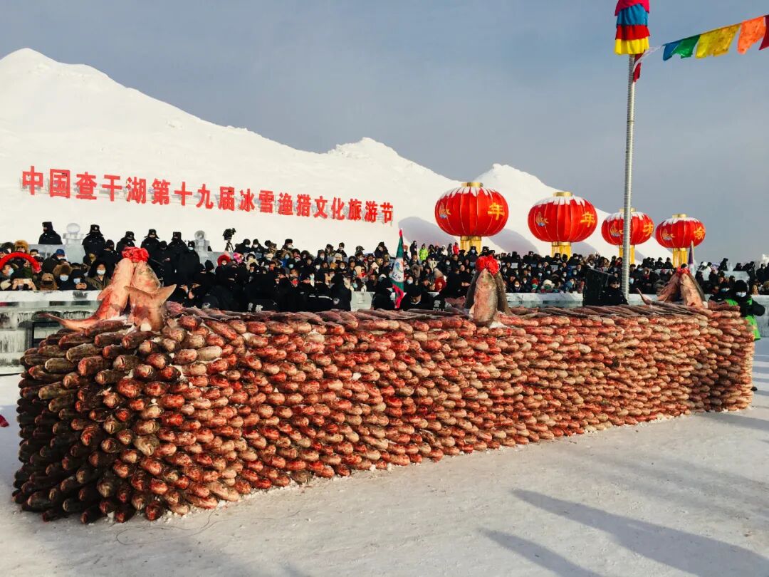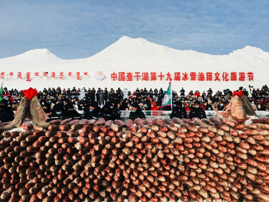 12月28日10时58分,“查干湖第十九届冰雪渔猎文化旅游节”在吉林省松原市查干湖景区捺钵广场开幕。经过激烈竞拍角逐,查干湖“头鱼”最终以2999999元的价格拍卖成交!开幕现场举行了“祭湖·醒网”仪式、火神舞、祭湖神、捕捞头鱼、头鱼拍卖等一系列传统活动,来自全国的游客共同沉浸在松原浓郁的满蒙风情和“马蹄踏破千层雪,长鞭抽开碧玉门”的冬捕乐趣中。查干湖冬捕源于史前,盛于辽金,已传承数千年。自2002年起,“查干湖冰雪渔猎文化旅游节”已连续成功举办了18届。本届冰雪渔猎文化旅游节将历时2个月,到2021年2月28日结束,更加突出“冰雪、绿色、文化”三大元素,富含“冰湖渔猎丰收季”“冰雪风情嘉年华”两个主题板块19项系列活动:2020年12月26日到2021年1月31日,查干湖北景区捺钵广场木棚区,松原特色农产品“查干湖年货大集”——松原市各乡镇“第一书记”成为摊主,为所在村屯的特色农产品代言;2020年12月28日到2021年2月3日“大网原始捕捞”、2021年2月4日到2月28日“小网渔猎体验”两个板块,“圣湖渔家冰雪情”生活体验游——游客们将在打鱼、炖鱼、杀年猪、蒸豆包、包饺子等体验活动中开心过年;2021年1月2日,查干湖旅游景区,“查干湖环湖冰雪马拉松赛”——冰雪马拉松爱好者将一边观赏圣湖冰雪美景,一边体验冰雪马拉松带来的别样乐趣……