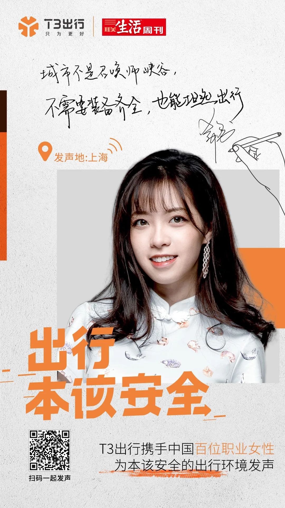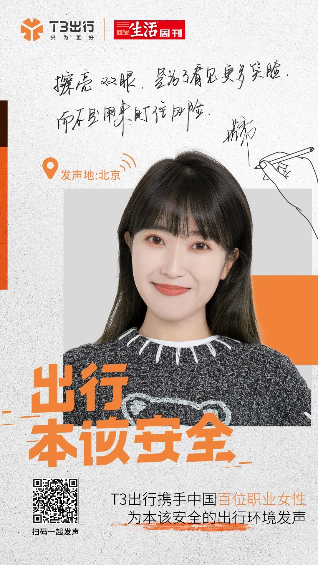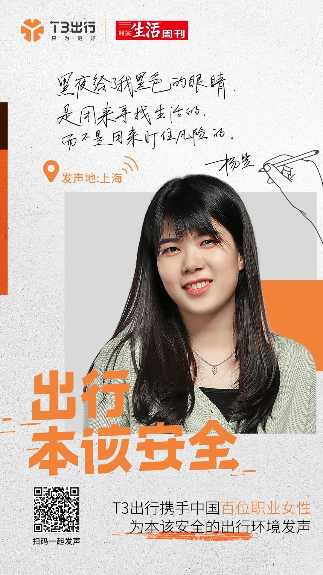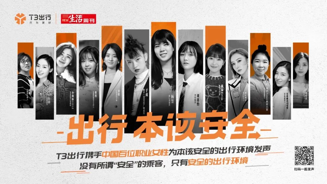 杨笠说得没错,出行本该安全!我们不能要求乘客“安全”,需要改变、完善的,是出行平台!T3出行致力于将本该安全的出行环境还给大众,也将无忧无虑做自己的权利交还给每一个她。想跟随百位女性,一起为安全出行发声吗?扫码下方海报即可参与!