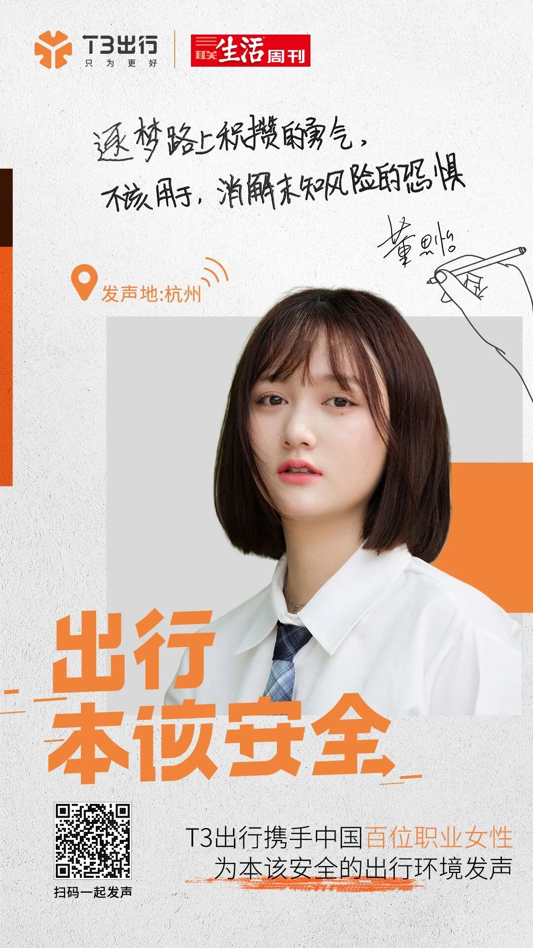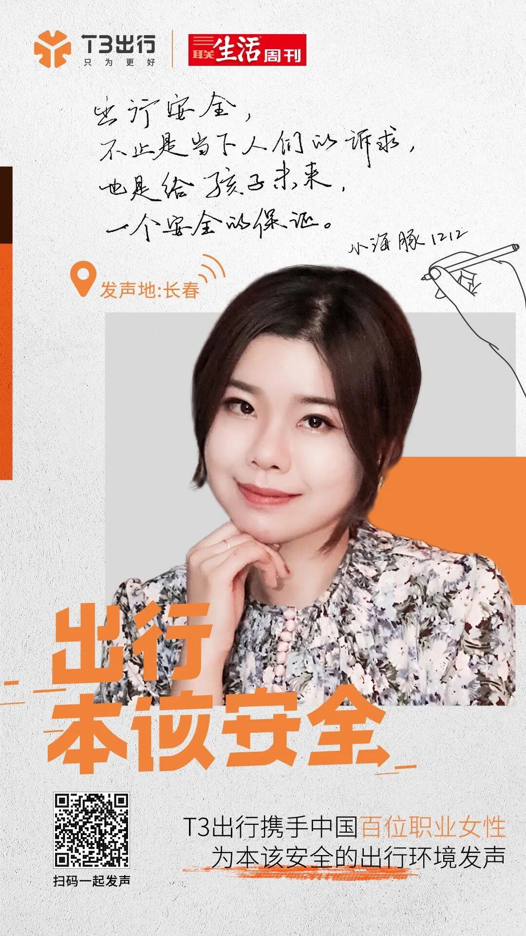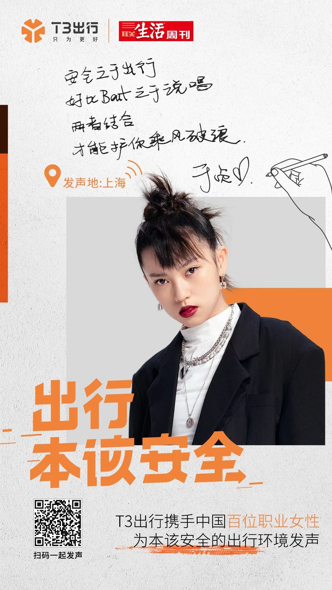 杨笠说得没错,出行本该安全!我们不能要求乘客“安全”,需要改变、完善的,是出行平台!T3出行致力于将本该安全的出行环境还给大众,也将无忧无虑做自己的权利交还给每一个她。想跟随百位女性,一起为安全出行发声吗?扫码下方海报即可参与!