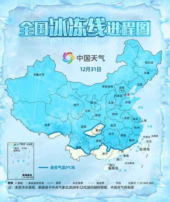 31日早晨,冰冻线将继续向南推进,抵达福建西部、广东北部、广西北部一带,届时超八成国土或将被“冰冻”。像广州、南宁、福州等地,最低气温虽然在0℃以上,但也不足5℃,寒意将十分明显。