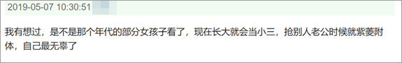 需要说明的是,「周末文艺」版上的评论只能视为一种舆论,不宜理解为官方的声音。同一日同一版面上出现的,有批判荧幕上「老爷」「丫鬟」宣扬了封建夫权的,批判刑侦剧里「厚黑」反派太有魅力的,甚至还有批判警匪片太多,要求多拍「健康向上、轻松欢快的优秀影视作品」。真正有官方意味的,是出现在 2009 年广电总局文件里的一条:「宣扬婚外恋、多角恋、一夜情、性虐待和换妻等不健康内容的」要「及时进行剪节、删除」。数年后,它在网上被总结为「主角切忌太花心,小三不能有幸福」。