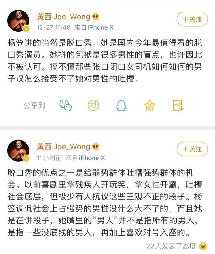黄西:以前喜剧拿残疾人开玩笑,拿女性开刷,吐槽社会底层,但极少有人抗议这些三观不正的段子,杨笠调侃社会上占强势的男性没什么大不了。