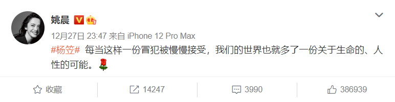 随后更有姚晨为了表达对杨笠的支持,半夜发文: