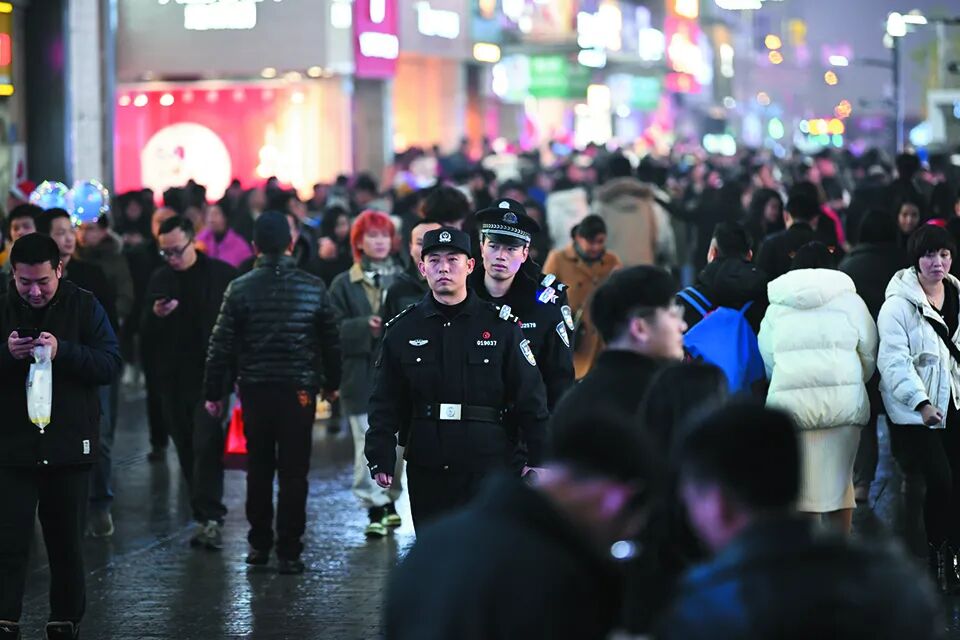 ▲解放西是长沙夜生活和娱乐的中心,坡子街派出所每天要处理大量醉酒引起的纠纷事件,忙碌到深夜。图为警长张鹏(左一)和同事正在巡逻。(受访者供图/图)