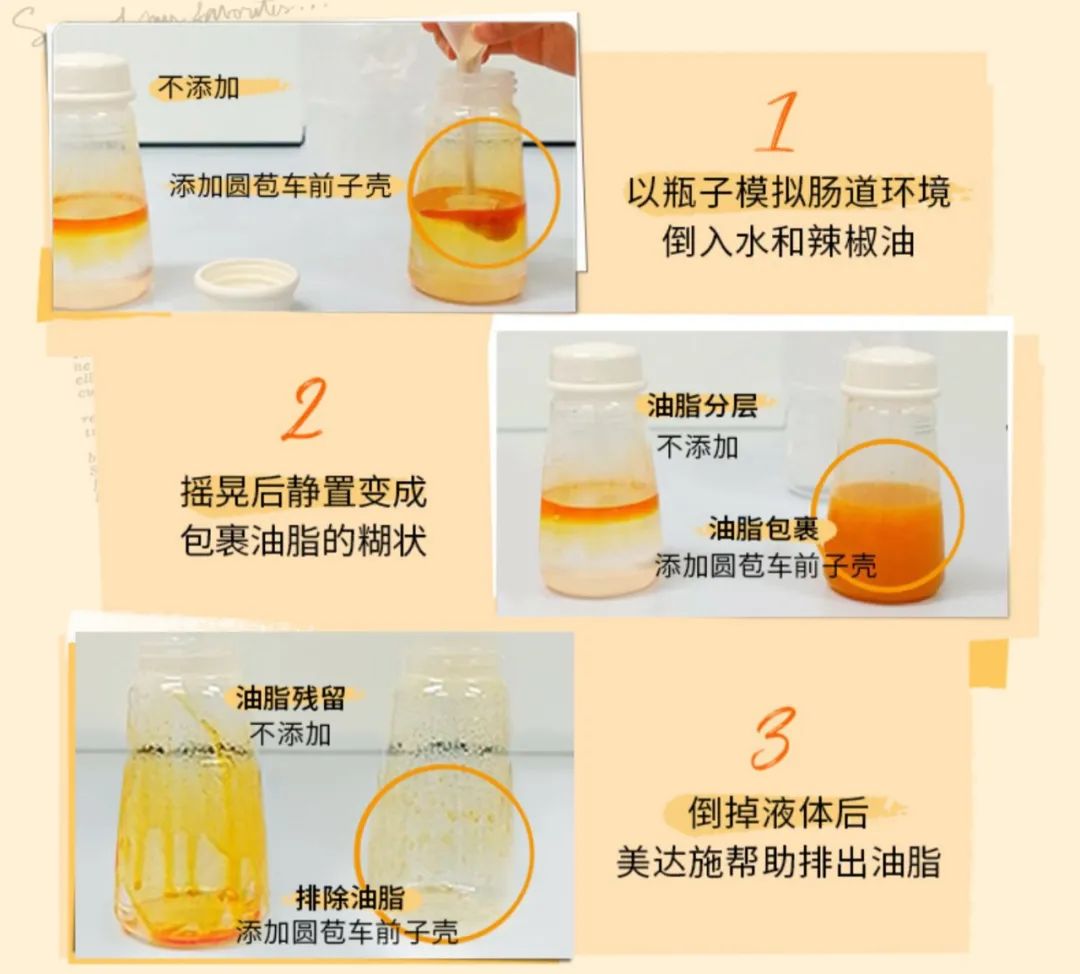 仔细看能看到饼干上有一些白色的谷物颗粒,那是天然洋车前子壳(又叫圆苞车前子壳)。▼天然洋车前子壳可是瘦身的好帮手,它被成为“纤维巨人”。上班族平常经常点外卖,但外卖里的膳食纤维可能无法满足每日所需。这个饼干里面添加了洋车前子壳,两片就有 5g 膳食纤维(相当于吃两斤黄瓜),快速、便捷地补充纤维。▼另一方面,美国临床营养学杂志刊载,洋车前子壳不仅能减少油脂吸收,还能降低胆固醇。洋车前子壳能有效包油、糖,促进肠道排出垃圾,做个小实验,看,油都被吸走了。▼有时候大鱼大肉、火锅烧烤吃多了,也可以来一块,用它帮忙刮刮油,吃大餐也安心很多。