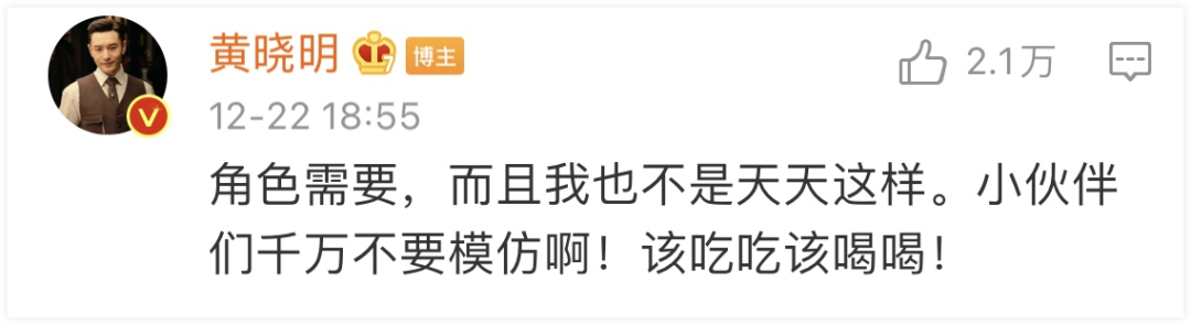 去《向往的生活》每次被劝吃一口,脑子里就开始疯狂自我鞭策。▼不吃晚饭,第二天起来称体重还胖了一斤,你说气人不气人。▼但是现在不一样了,这棱角分明的下颌线,突出的线条宛若“回炉重造”。看到大家反响这么强烈,晓明哥也大方地分享了他的“秘籍”。▼看见这份食谱,减肥党们刚刚点燃的热情瞬间就被浇灭了。不过,不吃不喝纯靠一口仙气续命确实能瘦,但对身体的伤害也是不可估量的。晓明哥在留言区跟大家重点强调,小伙伴们千万不要模仿!▼