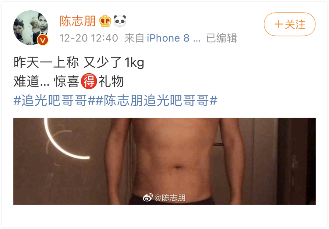 谁说减肥只是女生的终生事业?男生瘦下来也分分钟走上颜值巅峰。前段时间 if 姐刚分享过《追光吧哥哥》,如何去油?很重要的一招就是减肥。没想到几天之后,果然有哥哥成功了,瘦了 10公斤的陈志朋直接刷爆热搜。▼人瘦之后,不仅看上去更年轻,连肌肤状态都好了不少。▼事实证明,世界上没有油腻的男人,只有不努力的男人。
