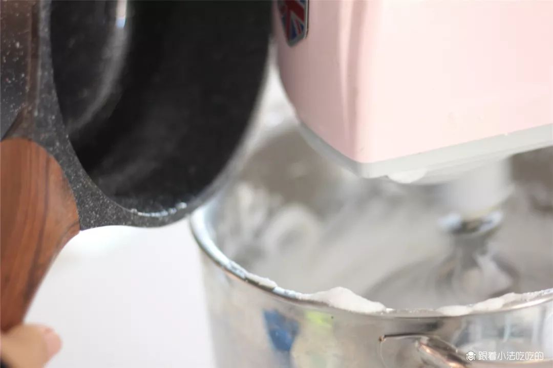 ①所有材料称量好,细砂糖和水倒入小锅中,中小火加热熬糖,中间无需搅拌,熬糖温度到118度的时候,立刻停火。③糖液118度的时候,用细细的直线方式,一点点少量慢慢地倒入打到硬度发泡的蛋白霜中去。