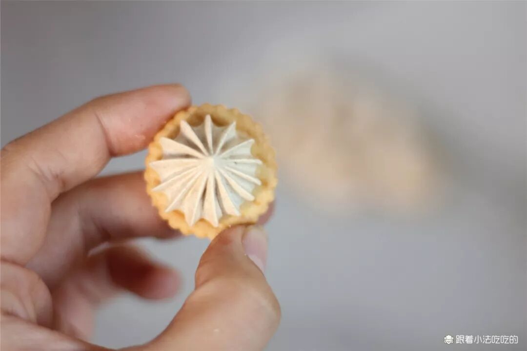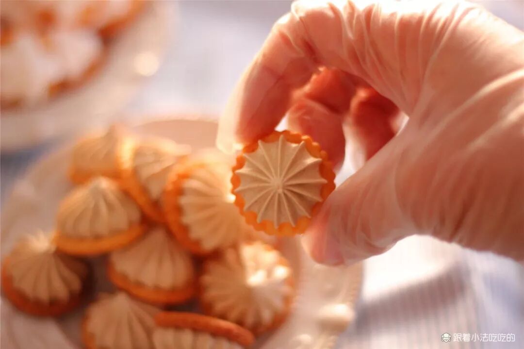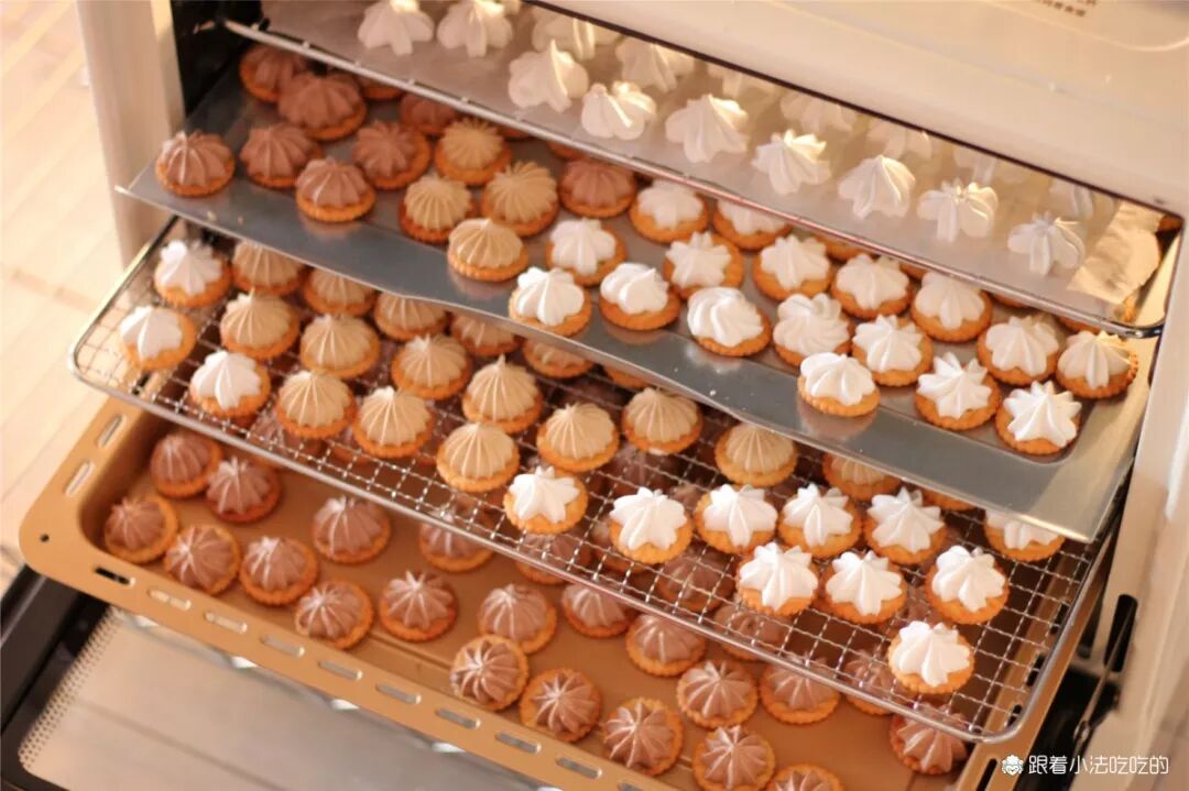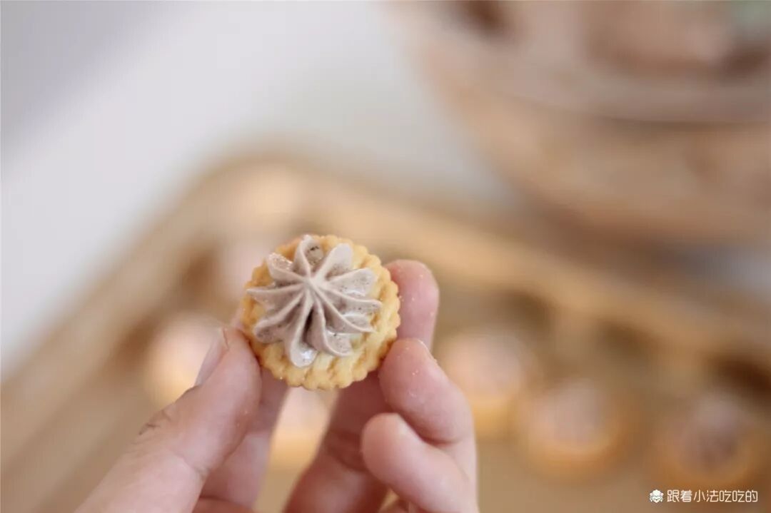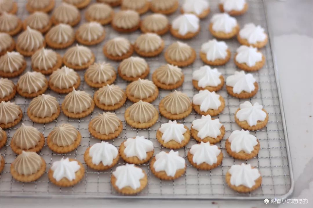 ⑨200g原味蛋白霜和10g咖啡粉翻拌均匀,做成咖啡口味的蛋白霜,在小奇福饼干上挤花。