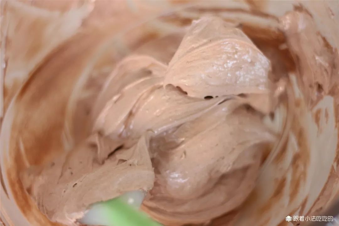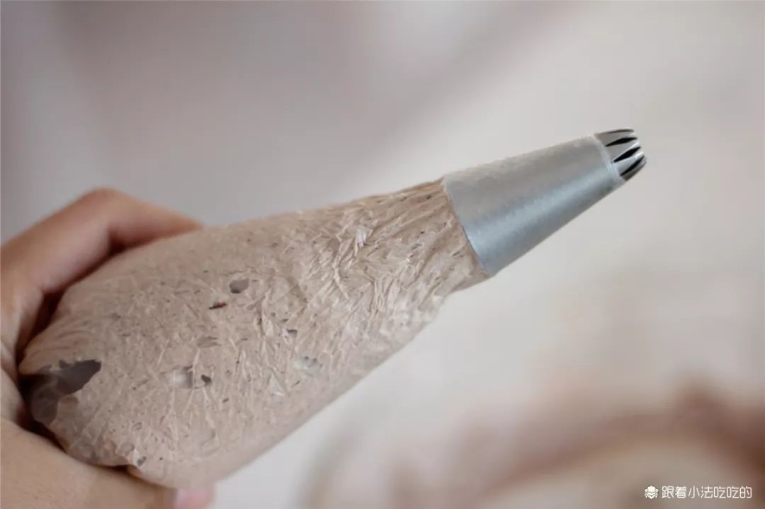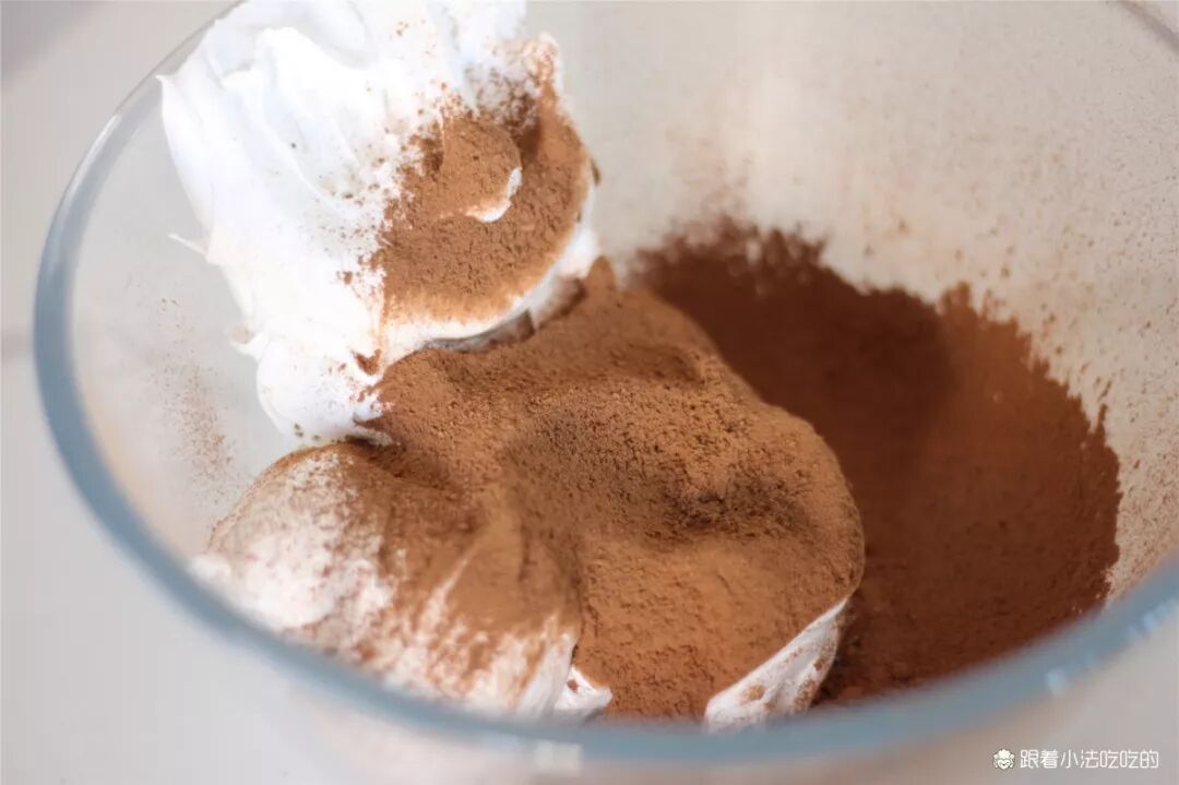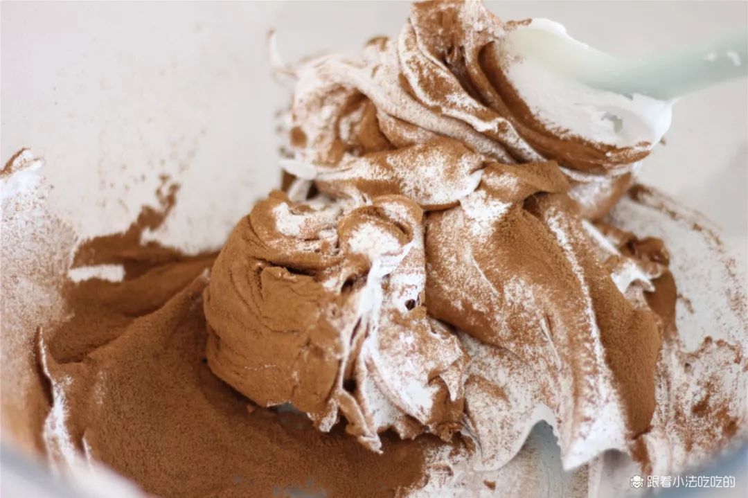 ④继续高速打发,2-3分钟温度慢慢地降下来。成为特别有光泽,呈现大弯钩似的意式蛋白霜。⑤蛋白霜取200g,筛入20g可可粉。可可粉一定要过筛加入,不然会结块拌不开或堵住裱花嘴哦。⑥用翻拌的方式,搅拌均匀,混合成可可巧克力味的蛋白霜。⑦装入裱花袋,用喜欢的裱花嘴挤出大花,这次用的是10齿的裱花嘴。