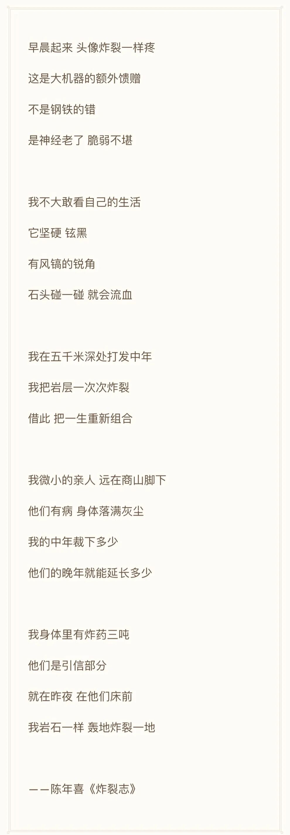 他把自己的生活磨成诗歌。2013年春,陈年喜写出了自己的成名作《炸裂志》。这首诗,让他一举跃入文坛。