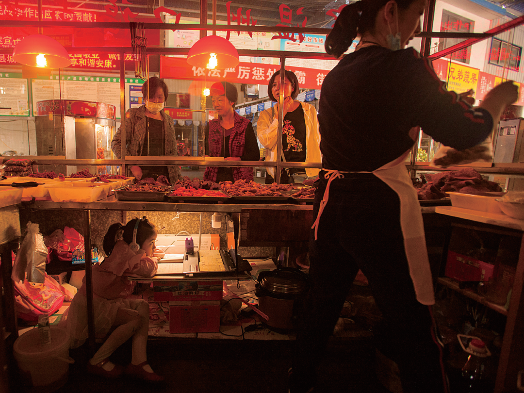 2020年5月12日,湖北省宜昌市,7岁女孩柯恩雅在父母经营的卤菜铺案板下上网课。/ 视觉中国
