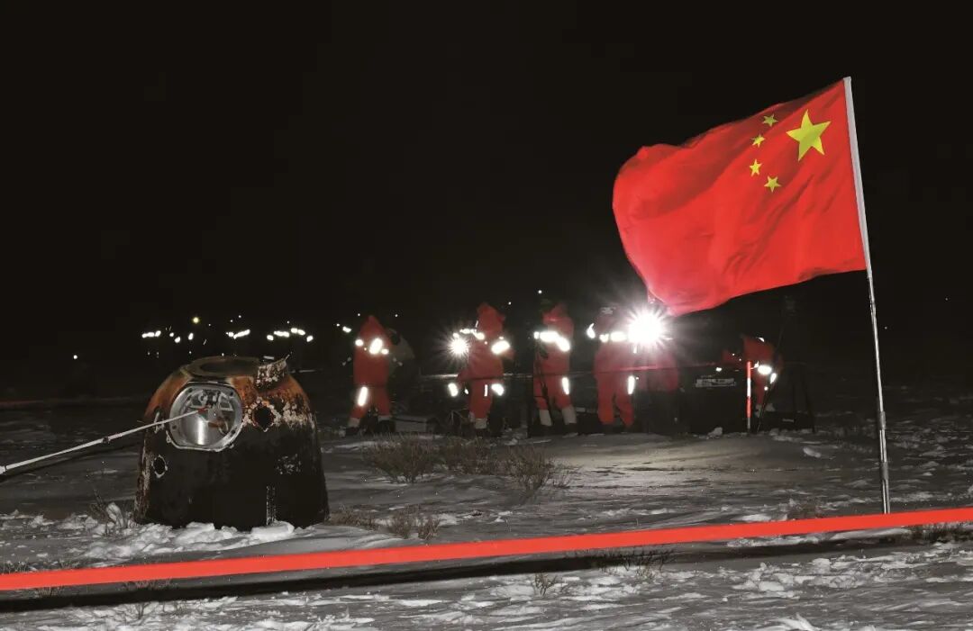 12月17日1时59分,嫦娥五号返回器,怀抱着采集完成的2千克月壤,在内蒙古四子王旗预定区域成功着陆,地球接收到由“嫦娥”带回的迄今人类获得的最年轻的月壤样品。
