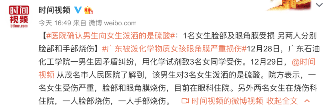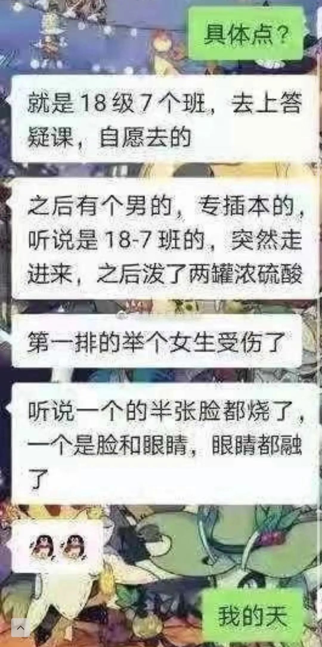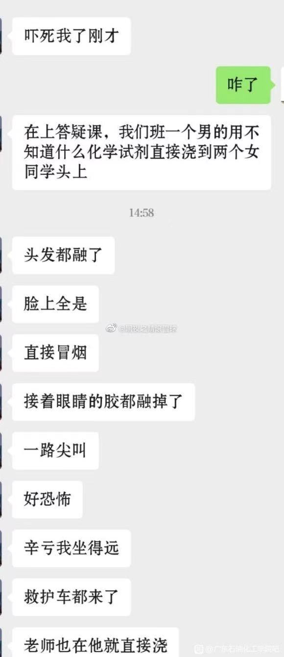 有消息称,广东石油化工学院一名男生,在上课时突然把浓硫酸浇在两名同班女生头上,导致女生受伤,这一爆料,很快也得到了学校官方的证实。