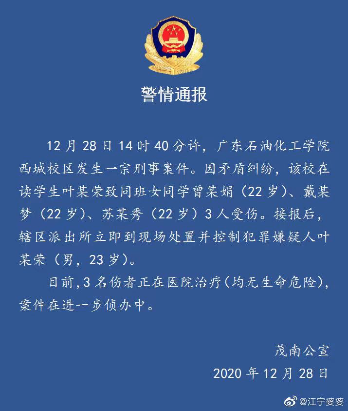 警方通报证实了广东石油化工学校西校区,有一名男生因矛盾纠纷致同班三名女生受伤。目前,三名伤者正在医院接受治疗。