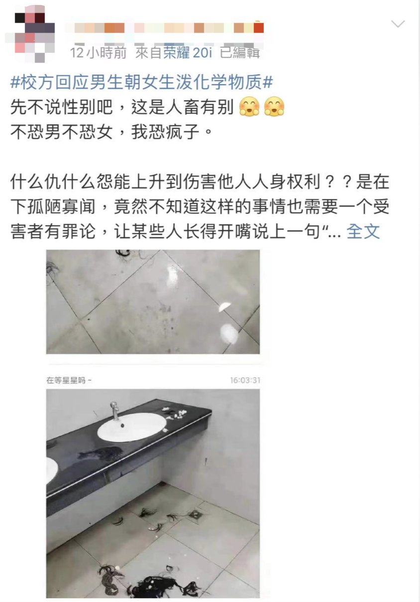 从更多爆料内容来看,这名男生用的化学试剂可能是浓硫酸。