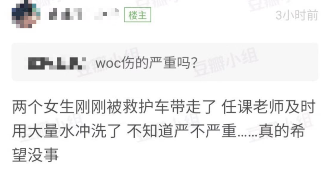 豆瓣恐婚恐育组的网友补充了更多细节,称任课老师及时用大量清水冲洗了两个受伤女生的伤口,救护车也很快赶到将两人送去了医院抢救。