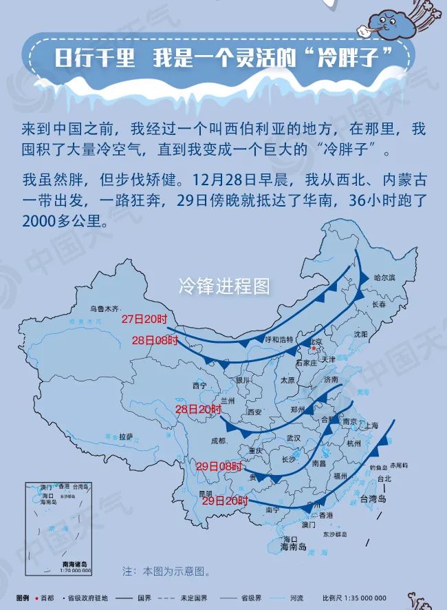 来到中国之前,我经过一个叫西伯利亚的地方,在那里,我囤积了大量冷空气,直到我变成一个巨大的“冷胖子”。我虽然胖,但步伐矫健。12月28日早晨,我从西北、内蒙古一带出发,一路狂奔,29日傍晚就抵达了华南,36小时跑了2000多公里。