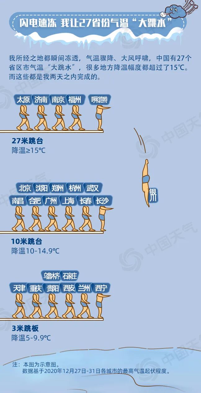 我所经之地都瞬间冻透,气温骤降、大风呼啸,中国有27个省区市气温“大跳水”,很多地方降温幅度都超过了15℃。而这些都是我两天之内完成的。