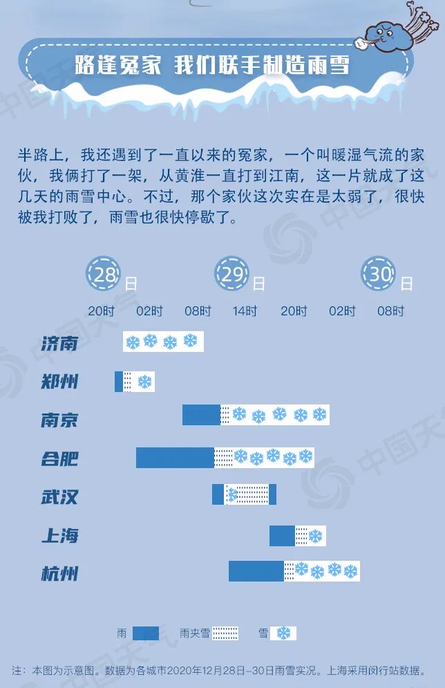 半路上,我还遇到了一直以来的冤家,一个叫暖湿气流的家伙,我俩打了一架,从黄淮一直打到江南,这一片就成了这几天的雨雪中心。不过,那个家伙这次实在是太弱了,很快被我打败了,雨雪也很快停歇了。