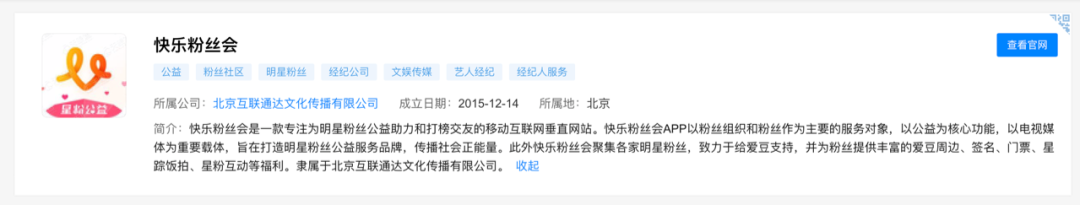 在Appstore平台上,快乐粉丝会的开发企业显示为“湖南爱豆科技有限公司”,而天眼查显示,其为北京互联通达文化传播有限公司旗下产品,而这家公司则是由互联网领域专业团队和众位神秘大咖共同创建。