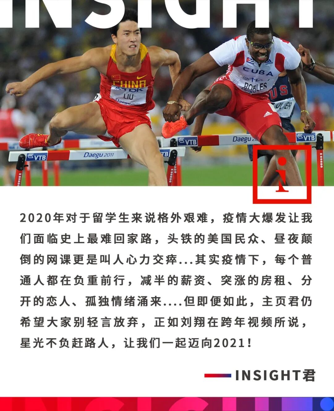 2020年,疫情的突然袭击让每个人陷入了迷茫和恐惧,但就像刘翔成功跨过人生低谷一样,每一个时代赶路人也从未被难阻挡。