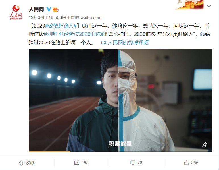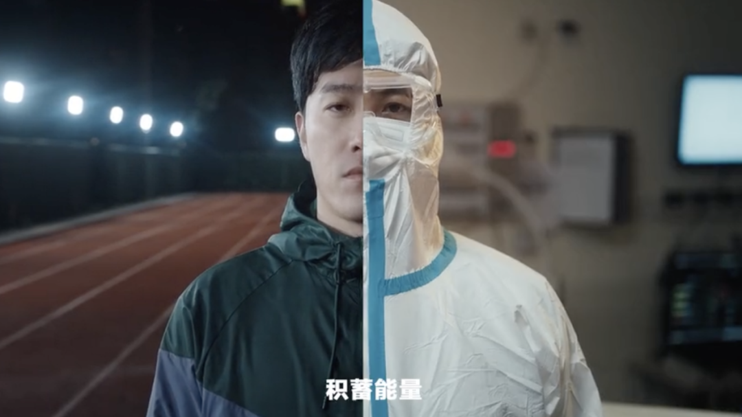 视频中,世界冠军刘翔和几位普通人的身影交叉重叠,在他向前奔跑的画面中,展现着2020这一年,普通人身上发生的平凡故事——医护工作人员在抗疫前线互相激励、外卖小哥在送餐路上加速奔跑、果蔬货农在田间地头售卖货品、商贩厨师在有条不紊地烹制食物....
