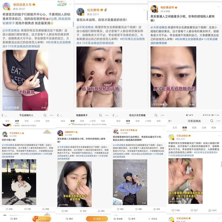 最近,在抖音上有许多网红发布了同一个内容的视频,叫做“希望每个女孩子,都看完这期视频。”那些平时化着精致妆容,梳着时髦发型,身材姣好的年轻女生,集体关掉了镜头的美颜,卸了妆,用前置原相机100X放大了自己身上的瑕疵。