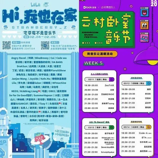 与此同时,我们看到越来越多的线上演出——网易云音乐的“云村卧室音乐节”,B站和摩登天空的“宅草莓不是音乐节”,抖音的“DOULive沙发音乐会”,各种平台,各种方式,眼花缭乱......."云蹦迪"应运而生。