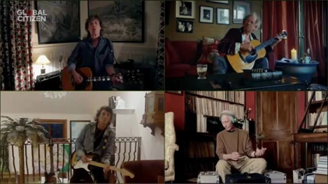 绿日主唱比利·乔唱坐在沙发上吉他弹唱,没了经典黑眼线妆,把摇滚名曲Wake Me UpWhen September Ends唱成了抒情金曲;酷玩乐队的马汀叔刚唱了两句Yellow,镜头就切换成抗疫视频,音乐淡出;滚石乐队的演出,则是乐队成员在各自家里画面的同框......