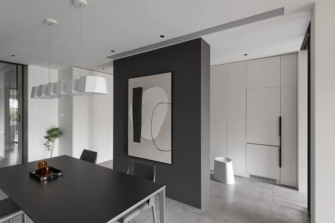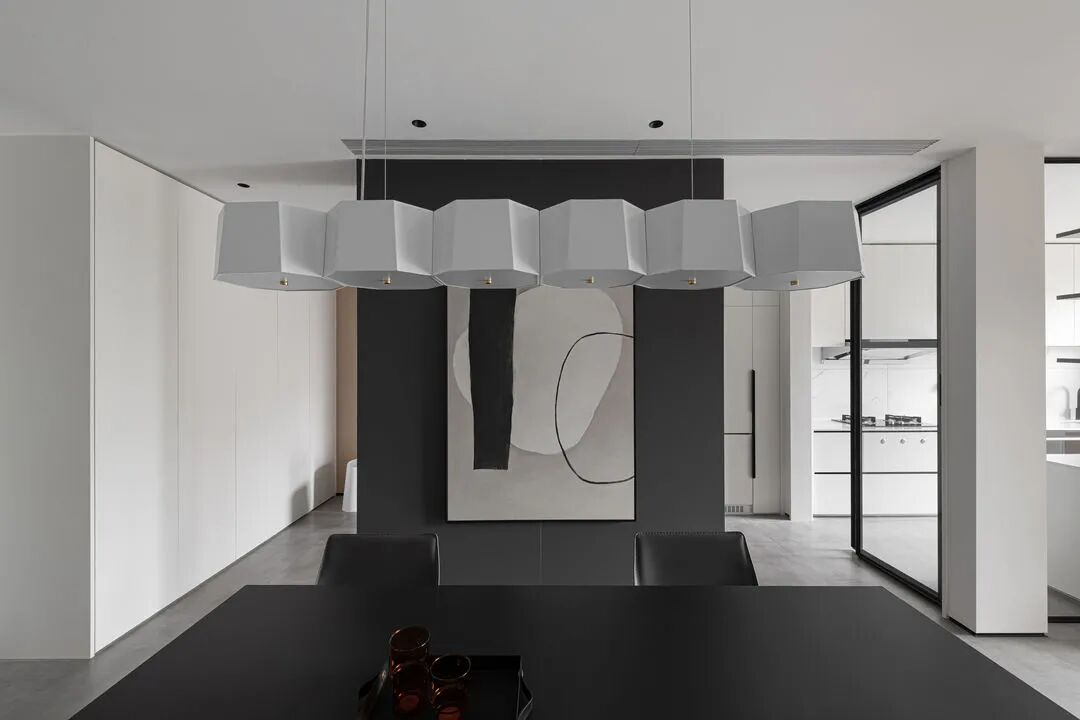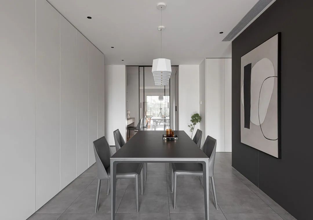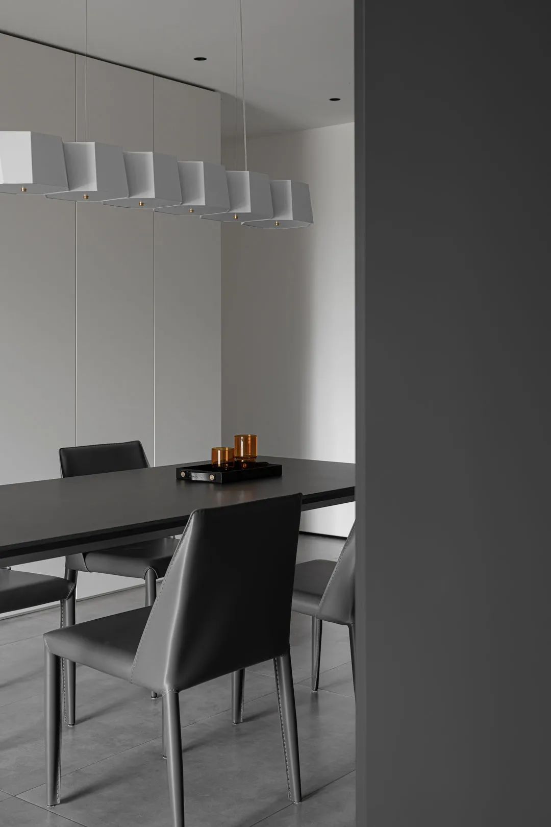 餐厅区域以黑白灰为主色调,简洁、干净、通透也是屋主理想中餐厅的模样。餐厅以吊灯为主要照明,顶部吊顶内置了嵌入式筒灯,作为氛围光的来源。顶部的中央空调出风口也选择了无边框风口,去除一切多余的线条,把简约发挥到极致。
