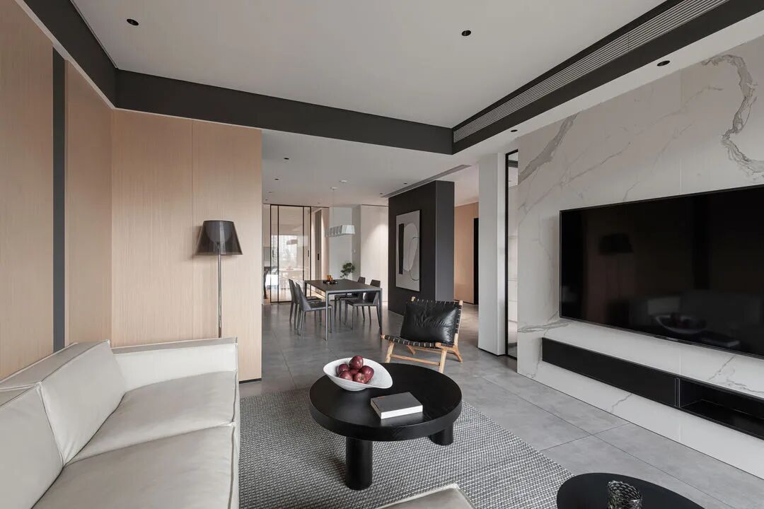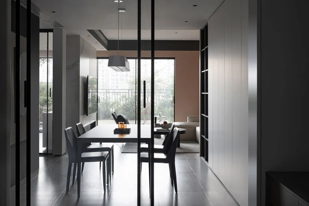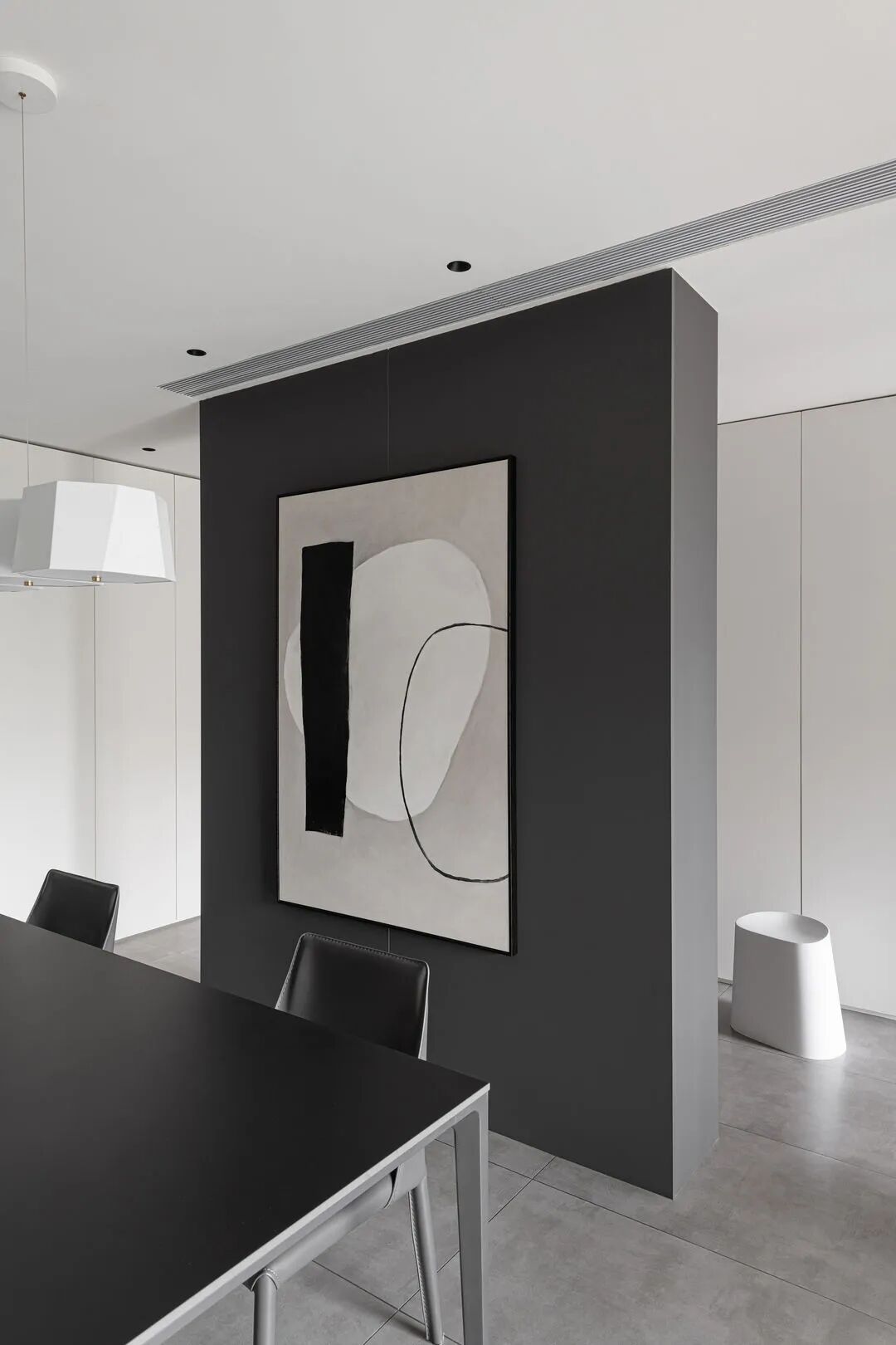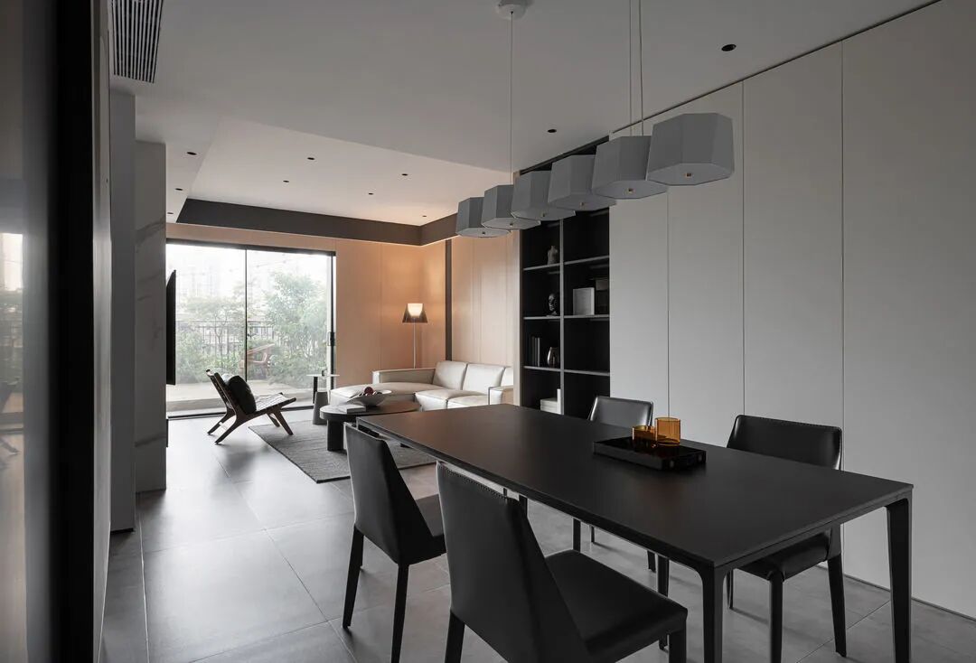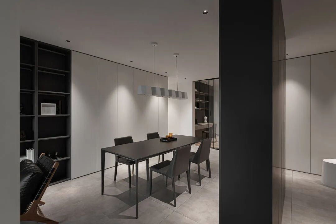 餐厅区域以黑白灰为主色调,简洁、干净、通透也是屋主理想中餐厅的模样。餐厅以吊灯为主要照明,顶部吊顶内置了嵌入式筒灯,作为氛围光的来源。顶部的中央空调出风口也选择了无边框风口,去除一切多余的线条,把简约发挥到极致。
