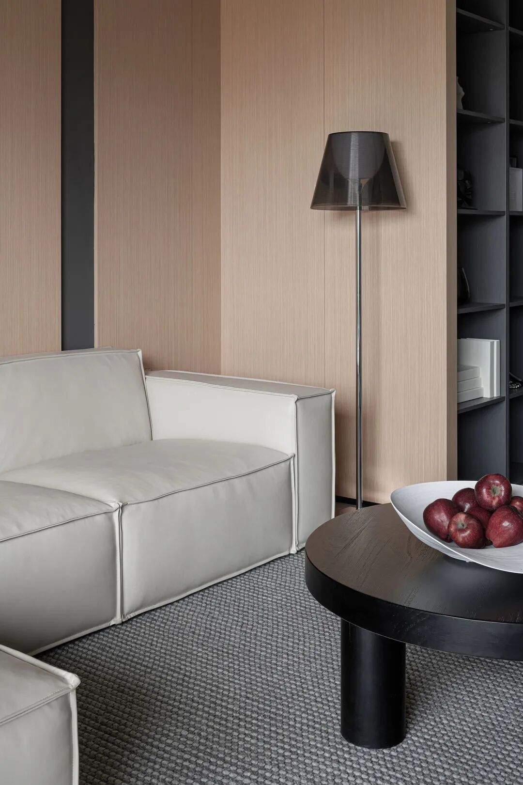 客厅沙发背景墙用木饰面装饰,以暖木色为主,奠定了温馨的气氛,米白色落地式沙发让空间更显松弛、舒适。