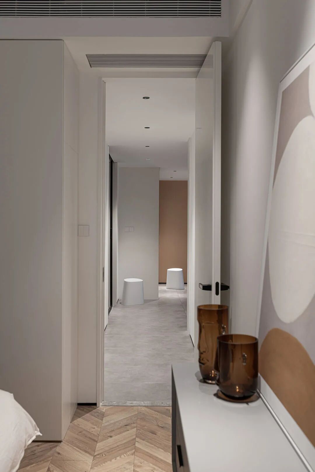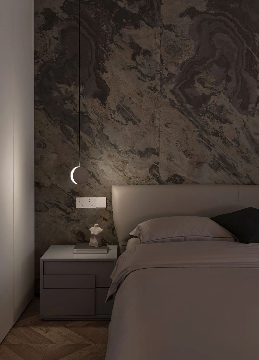 主卧延续了公共区域的白与灰。床头背景墙采用了新型材料——柔性石材,天然斑驳的纹理配上柔和的吊灯光束,有种宁静犹如置身夜空的感觉。卧室没有沿用公区的地砖,而是采用了鱼骨拼花地板,让卧室更温馨而丰富。