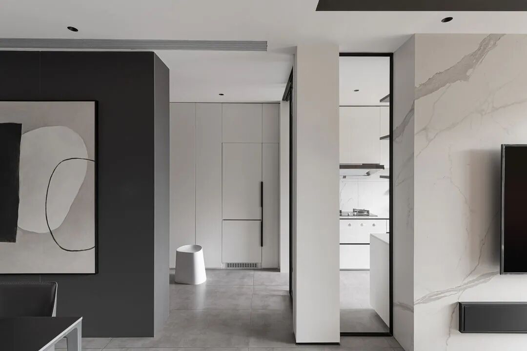 从入户门进入玄关,往左转是一排收纳柜,日常回家后脱下的外套包包可以临时放置在此处。收纳柜的最内侧是嵌入式冰箱,内嵌式冰箱的设计保持了收纳柜的完整统一,简洁又美观。买菜回家后往左转,把蔬菜水果放进冰箱,再进入旁边的厨房,动线流畅。