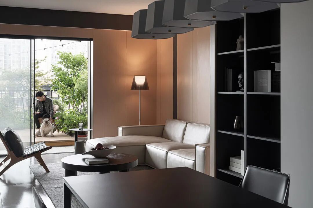 作为第四代建筑而常出现在短视频上的成都网红楼盘,正是屋主两人家的所在地。屋主是一对爱狗狗的年轻人,之所以选择这套带有空中花园的住宅,除了喜欢花草带来的这份闲适,更重要的是想给他们家胖乎乎的英斗一个自由撒欢儿的场地。与此同时,与建筑外观绿草丛生的凌乱美不同,屋主希望他们家里是干净整洁有条不紊的。
