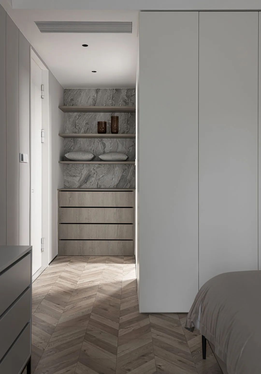 主卧过道背后设计了木质抽屉和隔板,背景是木板自带的纹理,不仅丰富了空间视觉,还对衣柜的储物功能进行了补充。