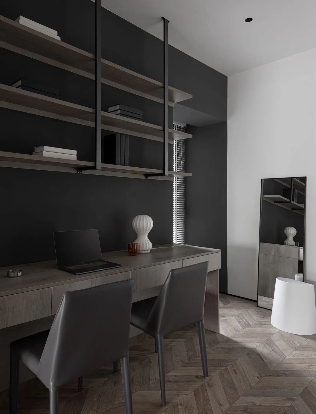 餐厅的黑色从餐桌、书柜逐渐延续到客厅的茶几、背景墙上,黑色串起了两个空间之间的联系,让两个不同的功能空间过渡得自然融洽。