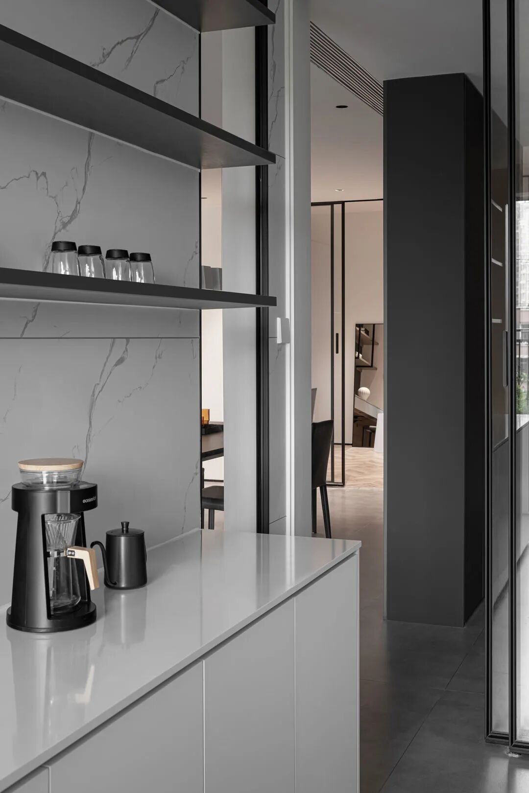 橱柜柜门都采用了无把手设计,没有多余的线条装饰,展现了极尽简约的克制之美。除了地柜和吊柜之外,还做了一些隔板放置常用的佐料食材,既对收纳功能做了补充,又不会让厨房显得狭小拥挤。