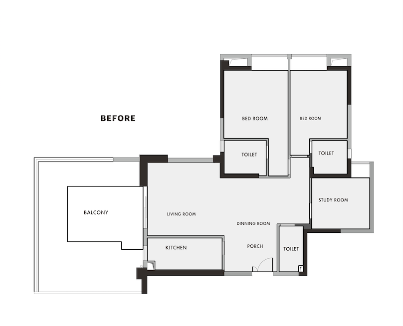 4.由于次卧父母偶尔来住,利用率低,便把次卧里的卫生间改到室外,作为公卫使用。